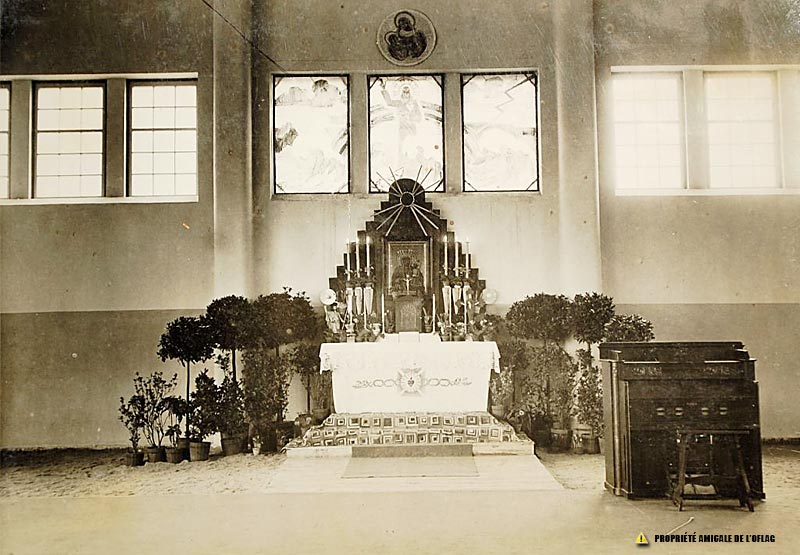 Oflag IIB Arnswalde : l’autel dans la Turnhalle à l’époque des prisonniers de guerre Polonais. A noter l’Harmonium.