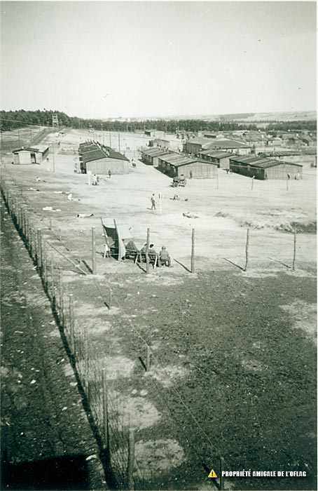 Oflag IID Gross-Born : Photo prise sans doute du mirador « nord-ouest » par une sentinelle. On voit à gauche les baraques du block I avec en premier et de droite à gauche les baraques 31 à 33 puis en second et de droite à gauche les baraques 34, 35 (baraque du tunnel où André RABIN trouve la mort le 18 Mars 1942, et 36. Au premier plan, on voit également la clôture séparant les blocks II et IV. |