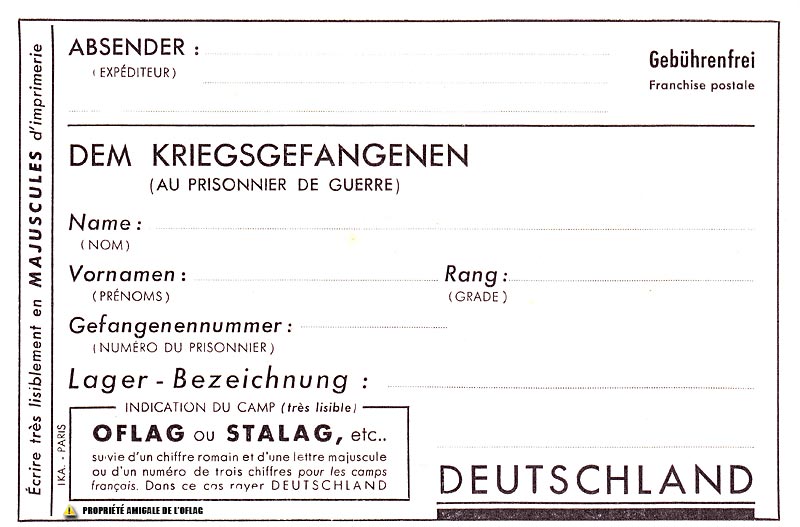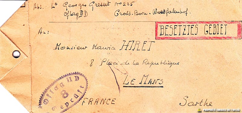 Etiquette (recto) officielle qui accompagne un colis envoyé par un prisonnier de l'Oflag IID, le lieutenant Georges GRESSET – matricule 225, à une personne qui fut prisonnier dans le même camp, Monsieur Maurice HIRET, sans doute rapatrié en France à la date (non connue) de l'envoi du colis. Monsieur GRESSET ne figure pas dans l'annuaire de 1946 de l'amicale qui contient 4200 noms. Monsieur HIRET y figure bien. Official label (front and back) accompanying a parcel sent by a prisoner of Oflag IID, Lieutenant Georges GRESSET - number 225, to a person who was a prisoner in the same camp, Mr Maurice HIRET, who was probably repatriated to France at the date (not known) of the sending of the parcel. Mr GRESSET does not appear in the 1946 directory of the amicale which contains 4200 names. Mr HIRET does appear in it. |