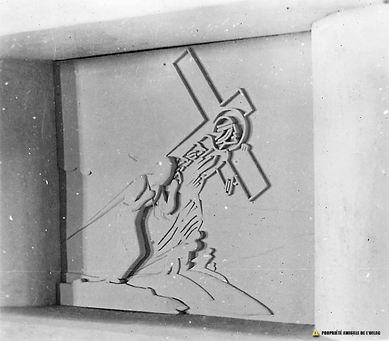 Oflag IID - Gross-Born : Autel moderne, en carton, avec bas-relief en carton, fabriqué à l'Oflag IID pour le Block I – Pâques 1941.