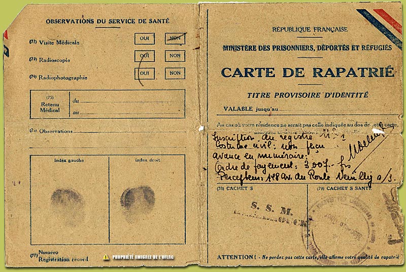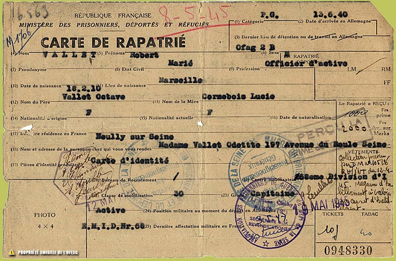 Recto de la carte de rapatrié du capitaine Robert VALLET.