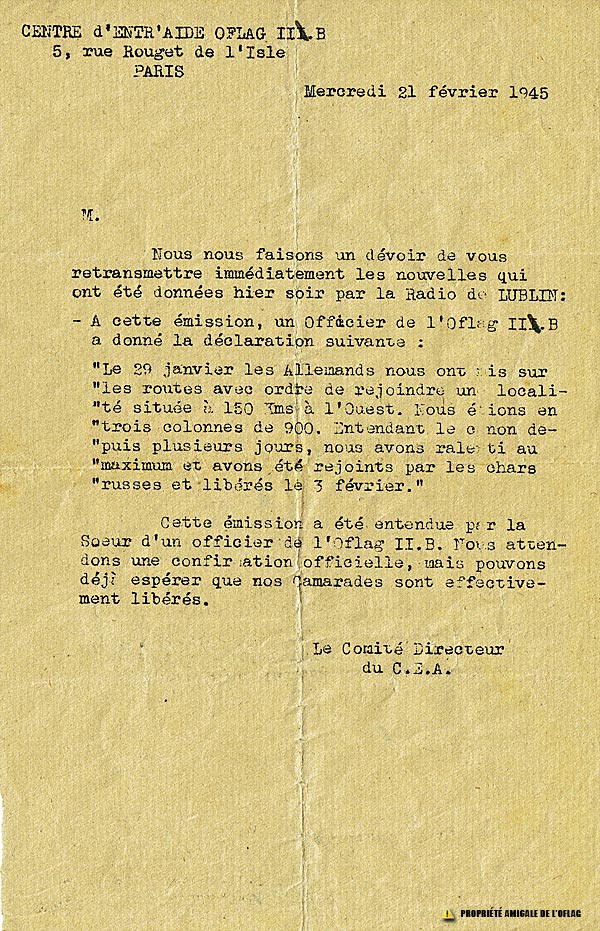 Circulaire n°1 du Centre d'Entraide de l'Oflag IIB datée du 21 février 1945, donnant des nouvelles des prisonniers de ce camp.