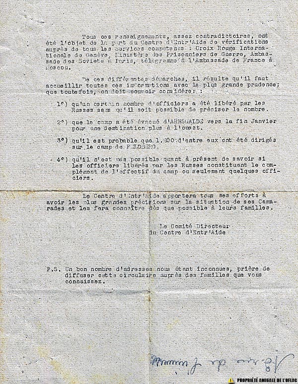 Verso de la circulaire n°2 du Centre d'Entraide de l'Oflag IIB datée du 1er mars 1945, donnant des nouvelles des prisonniers de ce camp.