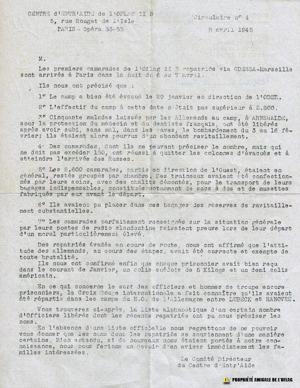 Recto de la circulaire n°4 du Centre d'Entraide de l'Oflag IIB datée du 8 avril 1945, donnant des nouvelles des prisonniers de ce camp.