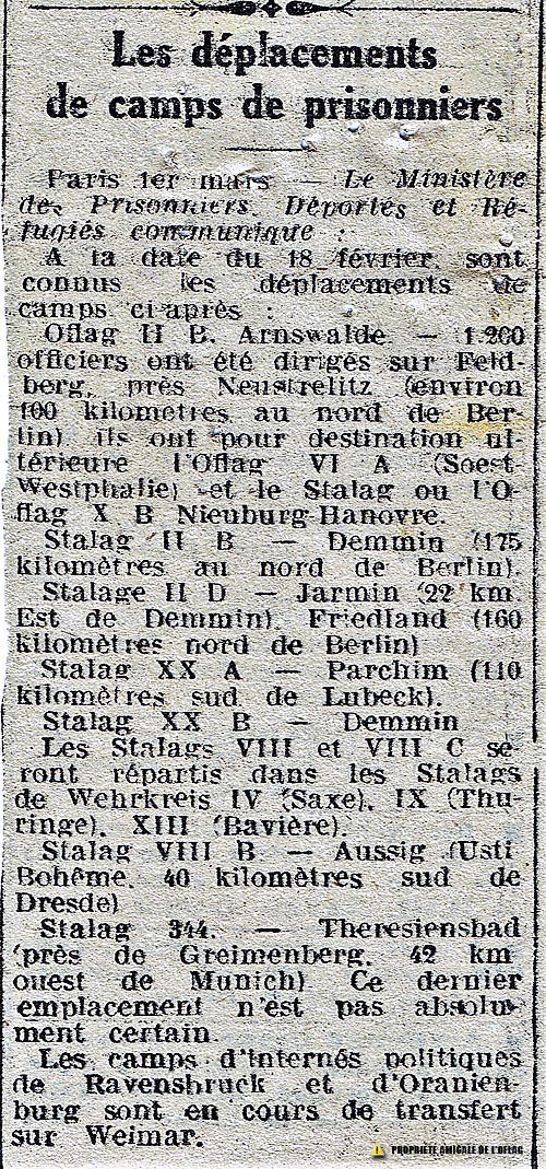 Article de presse donnant des nouvelles des prisonniers de l'Oflag IIB mais il comporte une erreur car ce ne sont pas "TOUS" les prisonniers de l'Oflag IIB qui ont été libérés par les Russes…