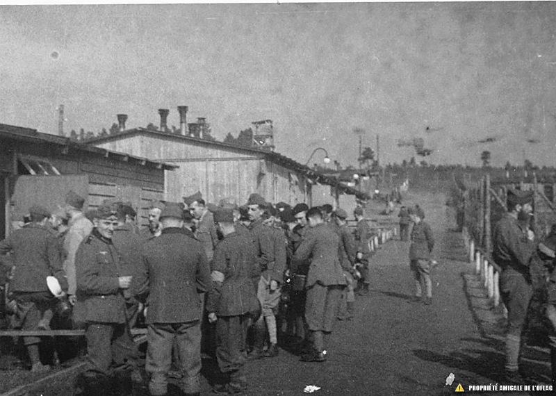 Gross-Born – Oflag IID : « La soupe ». A noter au 1er plan et de dos deux gardiens (posten) allemands.