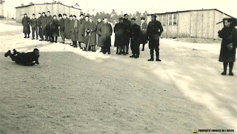 Oflag IID – Gross-Born : Prisonnier descendant en luge la « lande du diable » (teufel heide). Oflag IID - Gross-Born : Więzień zjeżdżający na sankach z "diabelskiego zbocza" (teufel heide). Oflag IID - Gross-Born : Prisoner sledging down the "devil's heide" (teufel heide).