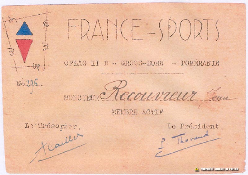 Carte de membre de l'association sportive "France Sport" du Lieutenant Jean RECOUVREUR - Oflag IID Gross-Born