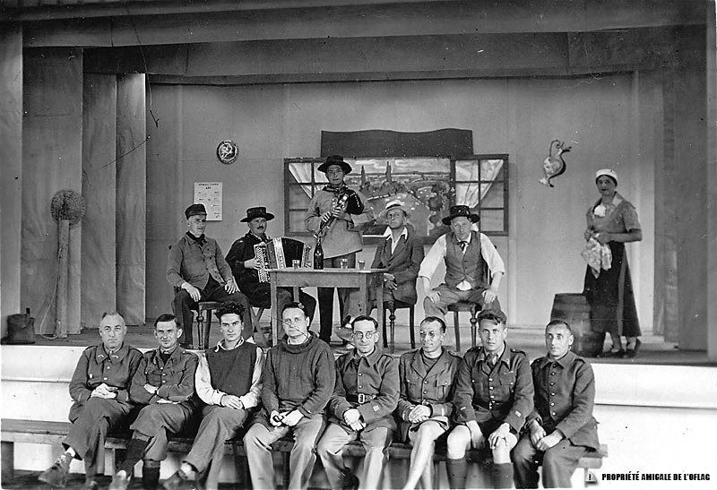 | Arnswalde Oflag IIB : Juin 1943 – folklore berrichon. Sur la scène de gauche à droite : AUDON, debout LELAIE,  puis MALLET, ROUILLAT, COUPET.
