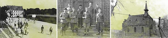 | Schubin - Oflag XXIB : le capitaine DUCHAUSSOY est peut-être le second assis en partant de la gauche | Schubin - Oflag XXIB : Cour centrale et baraquements des autres Cies (compagnies) | Oflag XXIB – Schubin – 25 Avril 1941 : « Devant Chapelle Oflag XXIB ». Au dos figurent les noms des 29 prisonniers photographiés. (cliquez sur l'image) | |