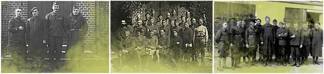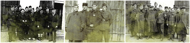 | Photo adressée par le capitaine Jean BAROTTE à des membres de sa famille, Mr et Mme BAROTTE demeurant à Versailles. Son numéro de prisonnier est : 5738. Il indique également : « 4ème compagnie Oflag XXIB ». Il est possible que le capitaine BAROTTE soit le 2ème officier en partant de la droite. Les deux officiers à sa droite sont des lieutenants mais on ne distingue pas de grade pour l’officier à sa gauche, d’où le doute qui subsiste. | Oflag XXIB – SCHUBIN : une photo d'officiers dans laquelle doit figurer Jules-Gaston MARCHAND qui, comme les autres prisonniers présents sur cette photo, n'est pas identifié. | Oflag XXIB de SCHUBIN : « L'adjudant René SCHWARTZ doit figurer sur cette photo mais il n'est pas identifié. Les autres prisonniers ne sont pas connus ». | |