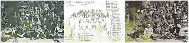| Oflag XXIB – Schubin : juillet 1941 - 5ème compagnie - 5ème travée (recto). | Oflag XXIB – Schubin : juillet 1941 - 5ème compagnie - 5ème travée (verso). En fait il faut inverser les noms écrits en légende avec les prisonniers présents sur la photo comme l'auteur de la légende l'a fait. Exemple : le n° 25 qui est le plus à DROITE de la légende est le personnage le plus à GAUCHE de la photo et idem pour tous les autres. | Oflag XXIB – Schubin : un groupe de prisonniers. | |