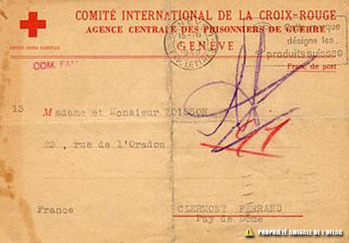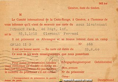 DOCUMENT DE LA CROIX ROUGE ANNONCANT A UNE FAMILLE LE FAIT QUE LEUR PROCHE EST EN CAPTIVITE A L'OFLAG IID de GROSS-BORN